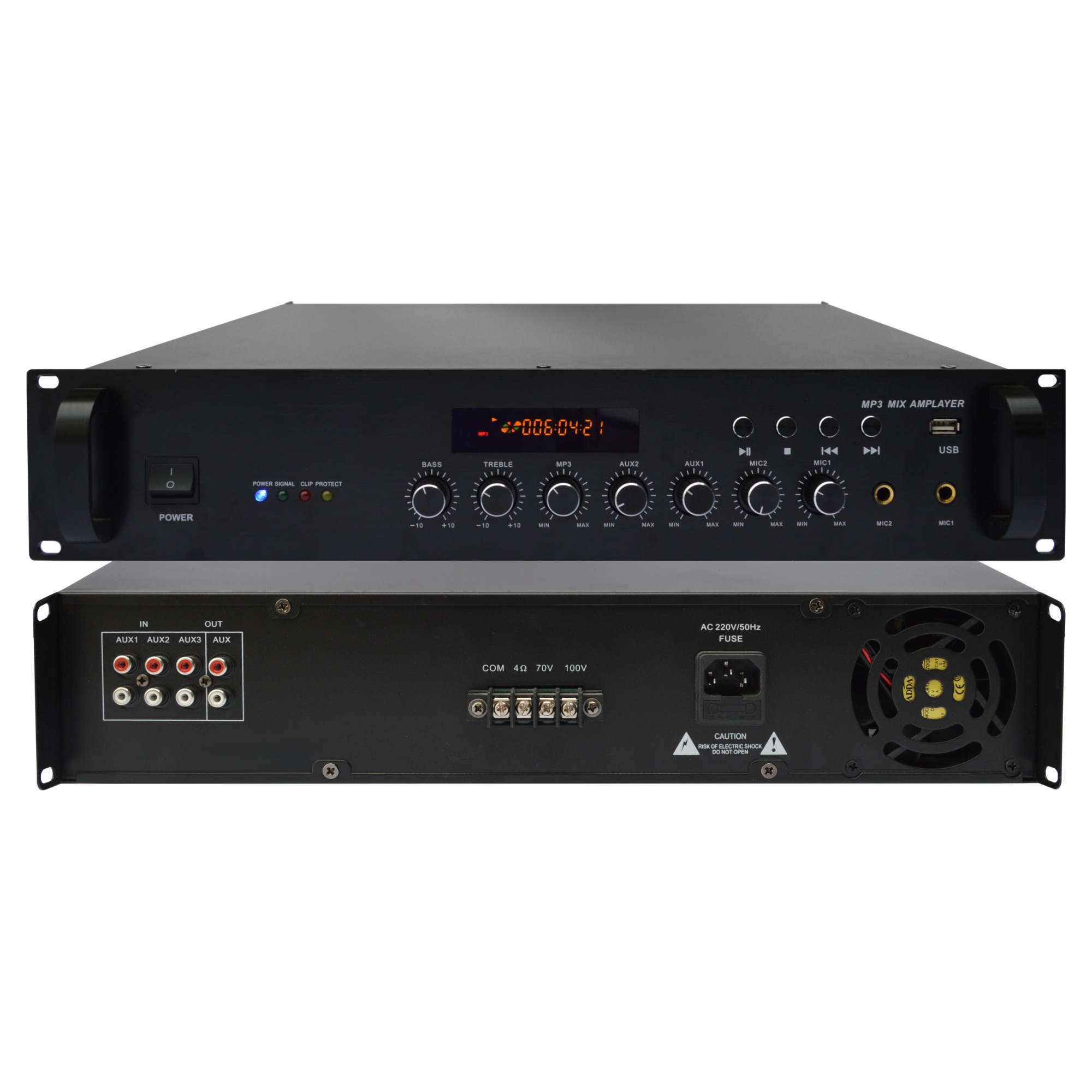2、采用先进高效功率放大电路,设有2路话筒输入,3路线路输入,1路辅助输出;